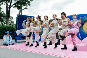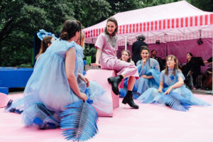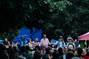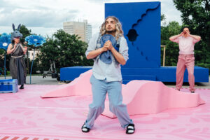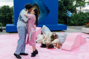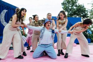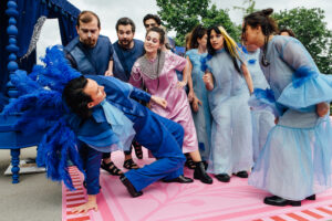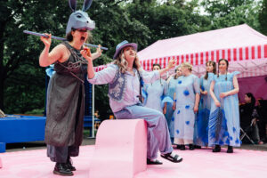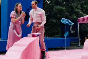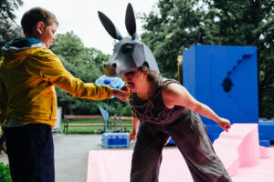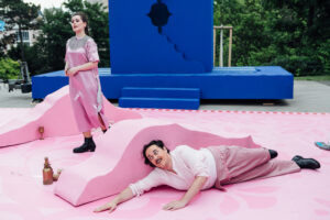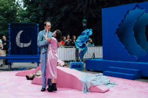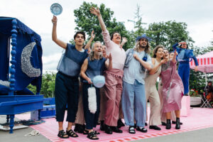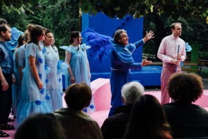 Fantasca and Janio are cast away on a desert island. Island-king Indigo wants Janio as advisor and Fantasca for his harem, but she plays for time. The king hears about a band of robbers in the woods and Fantasca gets him to offer her in marriage as a reward for catching them. She disguises herself and the harem as robbers, and Janio “captures” them. Then a ship turns up from nowhere and takes everyone back to Vienna. Director Anna Bernreitner presents Indigo in a travel-tour format performable at 23 different locations in Vienna.